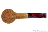 Dr. Bob has applied his deep and gnarly carved rustication to this graceful and flowing tapered bulldog for an eye catching update to a long applauded classic shape. Stemmed with a dark burgundy acrylic, the diamond tapered stem has a late bend and a touch of metallic fleck of amber inside, resulting in a matching subtle tone for the striking stummel accompanied by the rich, red color. Smooth and polished at the rim, this large chambered smoker is bent enough to clench, but its most impressive feature is the fantastic draw promising generations of outstanding smokes.