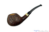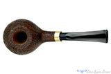 Deliciously textured in a weathered sandblast finish, this briar grown tomato has a shank cap of brass, a stem of ebonite, and best of all - a well fitted military mount. Able to be separated from the stummel, even while hot and midway through a bowl, this well fitted and sublime drawing drawing effort of craftmanship is going to be a favorite smoker. And what really gets us excited, the narrow chamber is going to be a godsend for any good virginia. Light enough to clench all day, with a little bling of brass, this dressy casual bent is easy to see when lighting, and a brilliantly constructed smoker.