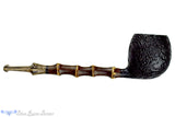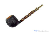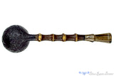 Sandblasted in a true black finish, this dark bamboo apple features a long thin shank of four knuckles and an ebonite stem of sand brindle. Marvelously lightweight, this clenchers dream pipe almost disappears when set between the teeth and still provides a chamber wide enough to support the enjoyment of Balkans or Lakeland blends.