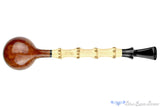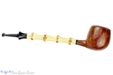 With four knuckles of clean bamboo composing a lengthy shank, this smooth prince from American carver, Doug Finlay, has just enough bend to clench comfortably without losing sight of the top of the bowl when lighting up. Steeply beveled at the smooth rim and featuring a balanced crown saddle stem, this bambooed beauty is just the right chamber size to enjoy a straight virginia or shag cut tobacco.