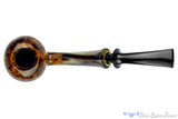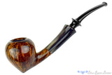Finished smooth in high-contrast to proudly display the radial straight grain and birdseye wrapped around this acorn and gathering at the bottom of the bowl's tip, this gorgeous bent and buffalo horn shanked handmade from Bulgaria was given an A Grade by its maker, George Bojadjiev. A simple and single flared saddle stem is just long enough to keep the long shank elegant without being cumbersome and the conically chambered bowl is perfect for virginia based blends but any favorite will do well here. A pleasure to hold in hand as the bowl is slightly wider than it is long, this timeless smoker is also a pleasure to draw on while clenched.