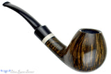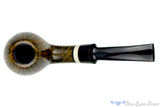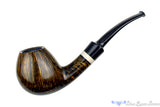 Exquisitely carved to celebrate the finest influences of Danish design, this bent and adorned scoop from Bulgarian carver George Boyadjiev, features a golden wheat hued smooth and spectacular high-contrast finish showcasing a dense pattern of straight grain on the walls and a stunning birdseye along the bottom. Even the lines on the back of the saddle echo those of the bowl and with a thin button and under bent poise, this sweet spot sized smoker is a comfortable choice that can handle any genre of tobacco. Like a light is hidden underneath the surface of the wood, this masterpiece represents the highest grade in George's repertoire.
