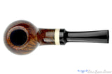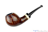 A contrast smooth finish and a well shaped bowl and shank direct this slightly bent canted egg from George to another of his outstanding smoking repertoire. A rich and dark finish of sunset and burgundy tones are further adorned with a trim of Elforyn - super tusk, a synthetic acrylic that marries the aesthetic qualities of ivory. This subtly bent briar also features a conical chamber of sweet-spot proportions that can easily handle any favorite blend combined with a superb draw making it an easy choice for the favorite rotation.