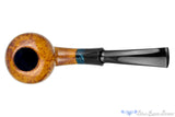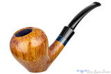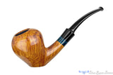 Unusually bright for a high-contrast smooth finish, George gave this excellent specimen of briar the best of color options to showcase all that densely packed grain oriented to the fat pear shape of this deep chambered sitter. A single band of midnight blue ebonite brindle adds a subtle pop of additional color to this smooth drawing masterpiece. Thick around the chamber and stable while at rest, this curvy saddled smoker makes for a functional work of art in any setting.
