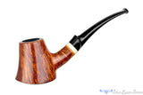 Finished smooth in a high-contrast blend of sunset orange and red hues, this bent volcano handmade pipe from George Boyadjiev has a recurring theme that starts with the curve at the front of the bowl and echoes at the back and a again at the base of the bowl and even at the sculpted half saddle. Light enough to clench and bent enough to be comfortable, this sweet spot sized chamber is slightly conical and well drilled with a smooth draw for several lifetimes of great smokes. The elforyn band, or juma, is a synthetic material made to resemble ivory.