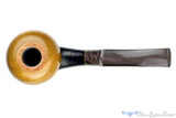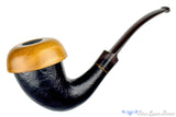 Replacing the traditional gourd with hand cut briar, this Charl Goussard calabash is the real deal with a removeable rim over a hollow chasm of briar, all fitted together with a delrin gasket as opposed to the traditional cork. The rich tones of the olive wood rim will get even richer and warmer with use, but the actual bowl is made of briar and narrow enough to get all the best flavors from a straight virginia without risking overwhelming the tongue. Fitted with an ebonite brindle stem of black, browns, and a hint of purple, this fine smoking implement draws like a dream and is a foolproof means of getting the driest and sweetest smoke from any tobacco.