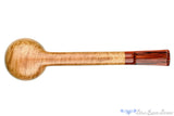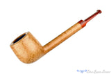 Clean lines and a smooth, pale finish that showcases a natural contrast display of grain, this lovat from South African carver, Charl Goussard, has a splash of color with a bright brindle stem of ebonite. Rounded at the rim of the thick walled bowl, this round shanked briar has a wide chamber but only weighs an ounce. Perfect for the clencher, this saddled smoker of birdseye beauty is well suited for any broad leaf blend.