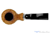 Celebrating the shapes that would be had briar been available in the Old World, this Ser Jacopo Spongia estate pipe from Italy is finished in a british tan with a carved texture rusticated around the whole of the stummel save the pedestal base beneath the bowl. Adorned with a heavy gauge and engraved silver, this acrylic stemmed smoker does have some inner rim darkening at the back of the bowl, but is otherwise in outstanding shape. Wide in the chamber and just deep enough to keep an ember slowly simmering for an hour or so, this sitter has an excellent smooth draw which is open enough to support a broad leaf or folded flake. Note this pipe comes with it's original box and sleeve.