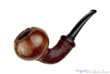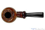 Although it does look like a modular construction, this raised tomato from South African pipemaker, Jan Pietenpauw, is handmade from a single block of briar. Sandblasted along the elbowed shank and adorned with a wide ring of cocobolo, this smooth bowled smoker is capped with a rim of natural plateau and features a consistent display of straight grain in mild contrast wrapping all the way around. Polished on the inside of the draft that meets the modest chamber's floor, this smooth drawing and singularly unique smoker draws remarkably well and wishes for a favorite blend to really show off.
