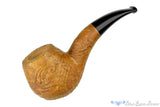Cleverly designed with a very bent shank, this Sine strawberry wood hawkbill from South African carver, Jan Pietenpauw has a wide chamber and a unique blast finish that can only be found in this smoking medium. Rest assured that a pipe cleaner passes without any issue and the draft hole rests all the way at the bottom of the thick walled bowl. Like every Pientenpauw pipe, this Sine draws exceptionally smooth and is eager to make flavorful smoke from any favorite folded flake or broad leaf blend. Note there is no bowl coating and we recommend this pipe be broken in over time. Upon request we are happy to apply a bowl coat at no cost so it's ready to smoke at full capacity upon arrival.