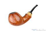 Sumptuous and magnificently grained, this high-contrast bent apple from Jared features an insert in the cookie jar saddle of citrus wood, providing a very clean trim to this mesmerizing smooth briar. Wrapped in dense grain all around the stummel, the bottom is an explosion of birdseye packed together for a stunning display of briar's radial end grain. Jared even took the time to fill in the very outer edge of the plateau's kiss with gold leaf making a fitting decoration for a fantastic specimen like this. All that would be enough to make any pipe enthusiast excited, but like all of Jared's creations, this bent apple is drilled with an equally impressive draw and tapered chamber promising not only turned heads when on display, but a stunning prowess when also lit.