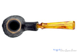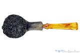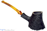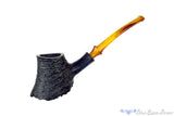 Built upon a base of outer burl plateau, this shapely volcano from American carver, Jared Coles has a bit of tipsy in its asymmetrical design. The base reaches forward and gives an echoing curve rippling from the front of the bowl to the back and again at the curved shanks face and the flared saddle of the bakelite stem. There is plenty of straight grain on display with the tightly blasted finish, but subtle growth rings also wrap all the way around the bowl. Just deep enough with a sweet spot sized chamber to enjoy any blend for just under an hour, this super smoker is so light it will practically disappear once lit only to be replaced with cool, dry, sweet smoke.