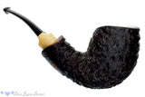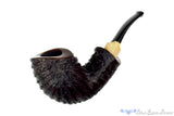 Sculpted with an asymmetric design and featuring a carved and rusticated finish, this smooth rimmed brandy from Jared also features a smooth shank's face and an insert of citrus wood into the stem's saddle. Unique and modern, this carved bent has a narrow enough chamber to enjoy with a sweet virginia and is deep enough to make it savoring experience longer than just a lunch break. Most important to us is the phenomenal detail, like every handmade from Jared, that goes from a balanced and new shape to a well engineered chamber and draft that promises a great smoke with every light.