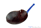 You won't find this unique variation of the blowfish on any shape chart, but Jared Coles has composed this compelling shape to unfold as the eye moves from one side, over the top of the chamber, to the other side revealing an asymmetric masterpiece of function and balance. One smooth panel traced from the fin that extends from the shank all the way along the bottom to the larger one extending from the rim. Stemmed with blue acrylic that looks like flowing water in the trail of this organic swimmer, the only thing more impressive than the shape is the engineering and draw. Beautiful to look at but exceptionally suited for a great session with a deep, hours long chamber, this gorgeous pipe just may be a favorite smoker for the ages.