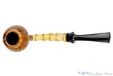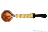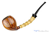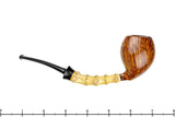 Well grained in a high-contrast smooth finish, this bamboo shank beauty from Jesek Pipes is splendidly bent with the use of five knuckles and a crown saddle stem. The bowl's grain, oriented to the shape, looks as if it blossomed into existence with such exuberance that the front lip spit with the kiss of plateau. Impressively constructed, this soothing and smooth smoker passes a cleaner without issue and with a sweet spot sized, slightly conical chamber, will soak the flavor from every last bit of tobacco.