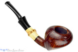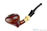 Gorgeously shaped with an under bent profile and a wide conical chamber, this Jesek Pipe has a single knuckle of pale bamboo and an elongated sculpted saddle to balance the the swollen bowl. The smooth finish is impressive, as is the radial straight grain and birdseye oriented to the shape, but the star of this show is the adornment of double seems around the bowl and especially the curled seem on the rim. A masterful work from Martin Paljesek, this smooth and well drilled strawberry will be a treasured part of any collection and worthy of heirloom status.