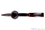 For this year's 2025 Halloween pipe Jesse chose a theme of the Headless Horseman. Before we get phone calls and emails, yes, we are aware that the Headless Horseman is in fact without a head, which makes pipe smoking particularly difficult. He does however carry a Jack-O'-Lantern and in wondering what might make a good pipe for a horse riding man holding a flaming pumpkin...well, you get the idea. The cavalier has been sandblasted to reveal a wavy cascade of growth rings wrapped around the bowl with a smooth and polished beveled inner rim that matches the color tone of the cumberland brindle stem and cap. Graceful, flowing lines envelop a shank and stem assembly that is perfectly tapered from the button down to the cap while the pitcher style lipped bowl sits with the articulate and crisp transition to the shank only seen in excellent handmade briars. Fully operational, the bottom spiked cap can be removed for maintenance and cleaning. Happy Halloween!