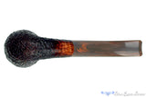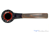 Deeply sandblasted with an antique finish showing peaks of vivid red, this bent horn is capped with the outer plateau of the burl and a smooth, polished bevel into the deep and slightly coned chamber. The brindle stem is gray with swirls of orange streaks that pick up the lighter tones in the finished briar. Flowing with curves, the late bend in the stem adds comfort to the low slung profile when clenched, allowing a good smoke with both hands free to deal with any necessary finishing blows.
