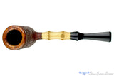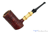 With a tall chamber and bowl, just narrow enough for a virginia and thick enough in the walls to remain cool to the touch throughout the smoke, this sitting and bamboo shank poker is quite sturdy when set down. Joe's use of two knuckles and the panel treatment of the flared saddle are all well done and the detailed blast is both distinct and tonal, from dark chocolate to rusty auburn. As with all of Joe's work, the draw here is phenomenal and full of promise for soothing smokes with minimal need to doctor the tobacco once it has been lit.