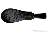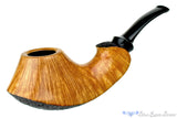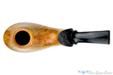 Marvelously oriented to demonstrate the beauty of naturally contrasting straight grained briar, this smooth topped volcano from American carver Clark Layton, of Layton Pipes fame, looks as if it erupted and the honeyed striations poured down over the vesuvian smoker. Sandblasted along the bottom to reveal the craters only possible with dense birdseye endgrain, Clark chose to wrap the dark panel all the way underneath to whip up into a tail. A sculpted saddle crown on the stem and a fantastic executed roundness to the rim gives a sense of weight and depth to the shape. A phenomenal accomplishment and an heirloom piece for generations, this sweet spot sized chambered smoker will always be ready to overflow with puffing acumen.