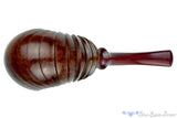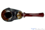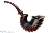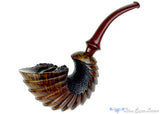 Carved into scales like a creature that took decades to form, this nautilus from MPipes carver, Marinko Neralić from Croatia, is a fantastic creation of texture repeating curves along the stummel. The rim is flanked with plateau on both sides and extends in smooth, polished birdseye ready to generate the next section. Stemmed with a classic red brindle, this traffic stopping creation of smoking satisfaction is also remarkably well drilled with the smoothest draw to support a chamber wide enough to enjoy with almost any large leaf blend.