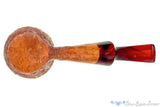 If you count the rings on this sandblasted dublin sitter handmade from American pipemaker, Nate King, it can easily be proven that this particular well shaped and natural finished sitter's briar wood took over half a century to grow. The detail is staggering and the pale rim displays the outer edge of the burl's plateau in a contrast of lighter polish. Stemmed with a limited edition resin that is more durable than ebonite and softer than acrylic, this gorgeous and distinctly detailed smoker will warm in color with use becoming richer in character over time with each satisfying bowl.