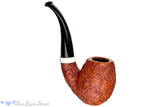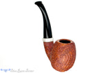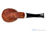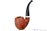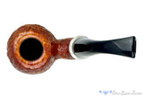 Deep in the chamber and fully bent in the shank, this Royal Egg from Nate King is indeed a functional reverse calabash smoker. There is a large chamber that has been polished smooth in the shank that extends through a wide tenon into the stem, that serves as a cooling and drying reservoir for the smoke, one mouthful at a time. Guaranteed to smoke wonderfully well, no matter what the tobacco, this well blasted egg has a smooth and rounded rim, and the whole piece is punctuated by a ring of old school, marbled white bakelite.