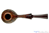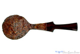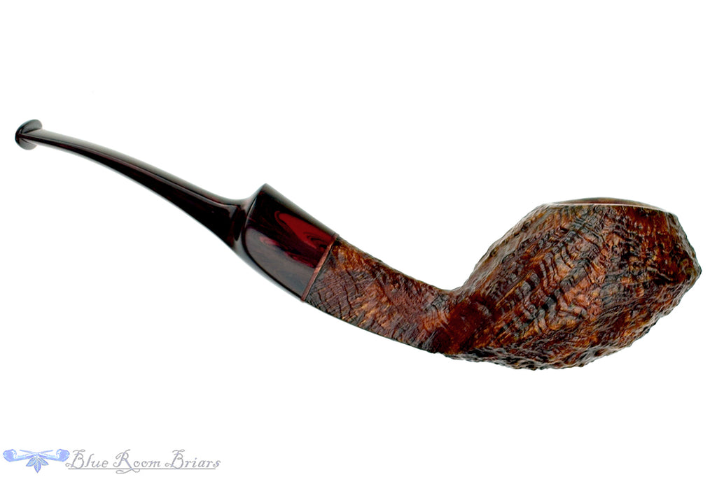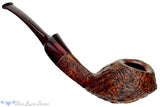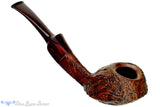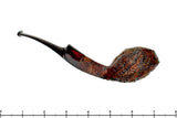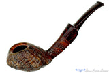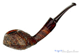 With a pinched transition from the wide bowl to the flared shank and the stylized whiptail in the saddle, this unique shape from talented American carver, Nate King is given greater depth with a deep and craggy blast finish of multiple tones and a matching cumberland brindle stem. Smooth and polished at the rim that bevels into the sweet spot sized chamber, this underbent Risus is surprisingly comfortable in both the palm and while clenched. Wrapped with the bowl inside the fingers or over the shank with the thumb on the underside of the saddle, this effortlessly drawing beauty will do exceedingly well no matter what tobacco is used or how it is smoked.