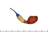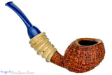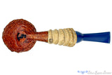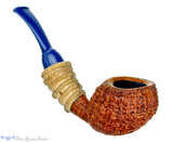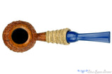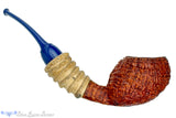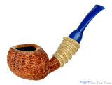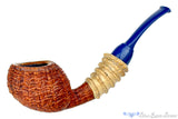 Webs of straight grain and deeply distinctive rings engulf this low slung and british tan blasted apple from Nate. Harnessed to a bent piece of aggressively noduled bamboo, the reverse taper of the shank blossoms with ripples of rounded knuckles reverberating up the shank into a masterfully balanced bend. Artfully topped with a nautical blue stem of ebonite and punctuated with a rounded cookie jar saddle, the concert of color, finish, texture, and detail form a dynamic symphony, mastefully performed with every detail. Well sized with enough room in the chamber to easily cover the majority of preferences for taste and tobacco, this imaginative sculpture is underbent to ride comfortably low when easily clenched. Terrifically unique, this handmade piece of smoking instrument hits all the right notes.