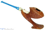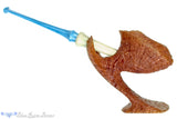 Speared in the back of the bowl with a bakelite ferrule and stemmed with the same material of bright ocean blue, this tsunami standing handmade from Nate is both the embodiment of fierce natural forces and the respite of enjoying a favorite blend. While the dramatic pose of the stummel expresses movement and poise, any lover of good tobacco understands the peace that a perfect smoke can bring. Brought together and placed in a travel box for secure storage and mobility, this breathtaking piece of smokable art is only the seventh handmade from Nate to achieve the Sceptre Grade designation and make no mistake, yes. It will absolutely smoke your socks off.
