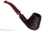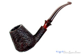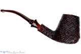 Exceptionally well blasted, this gnarly and deep crevice finished bent Boda estate pipe from Israel does have a replacement stem. A flare in the new stem, coupled with the dark red amber that matches the undertone of the black blast works well and while not originally intended, the whole composition is still quite fetching. In excellent shape with a draft drilled to the bottom of the deep and wide, slightly conical chamber, this well insulated bowl is also quite clenchable.