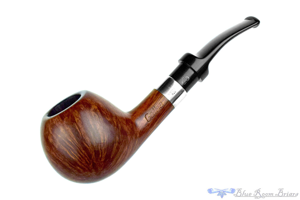Nicely grained with a radial pattern that starts at the heel and travels up the wide and plump apple bowl as well as down the shank, this Design Berlin Gotha estate pipe from Germany is further enhanced with a band of sterling silver and an offset acrylic stem. The unusual saddle design helps elongate the feel while the massive walls help insulate the ember for a smooth smoker that will be easy to burn to the bottom. In outstanding condition with some inner rim darkening and a few minor handling marks, this German briar can accommodate a 6mm filter, draws like a dream, and longs for any favorite large cut or tongue friendly, complex tobacco blend. Note that this pipe comes with its original sleeve.