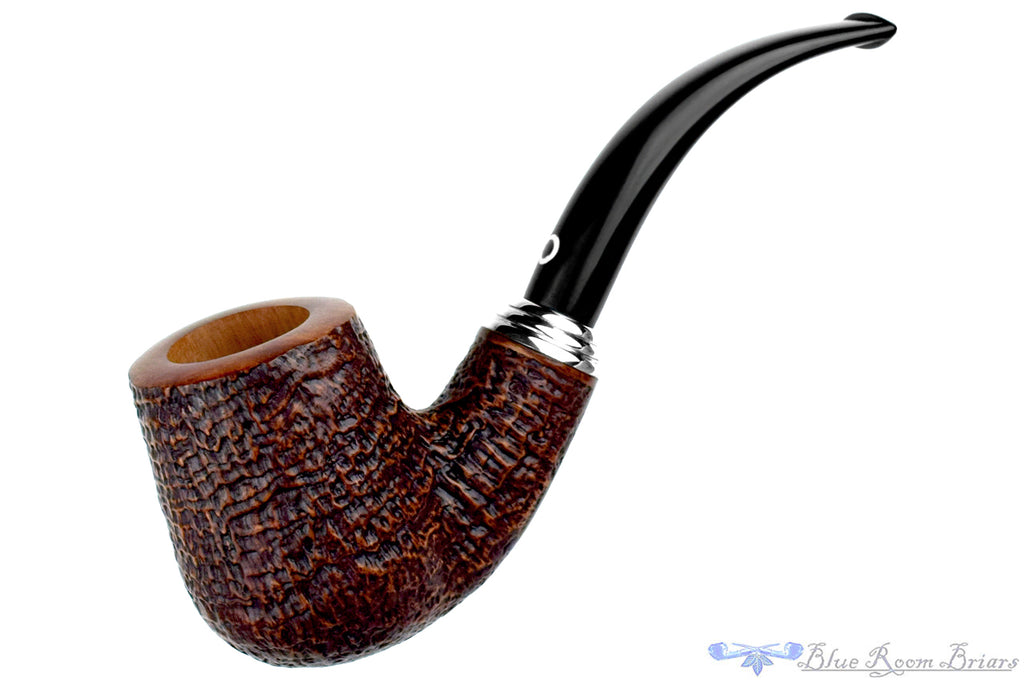 Completely UNSMOKED and dressed in a contrast sandblast finish of dark and reddish brown, this Il Ceppo bent billiard is further adorned with a smooth, broad rim and a shank cap of silver. Handmade in Italy, this stunning smoker has a wide and cylindrical chamber of significant depth for enjoying the flavors from English and Balkan blends for hours at a time. Note that this pipe is in pristine condition and comes with its original box and sleeve.