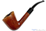 Handmade in England, this James Upshall displays a breathtaking and dense pattern of straight grain wrapped all the way around the very large bowl. The plateau topped rim has been left unfinished and there is some darkening around the inner rim. The original stem suffered a dangerous toothmark on the underside and although still completely functional, the guys in the workshop have supplied an additional one with a smoother draw to make sure this gorgeous English handmade smokes as well as possible.