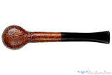 Classic proportions from the English school of design, this native Orlik De Luxe sandblast billiard estate pipe has a thick wall in the bowl and a reasonably narrow and conical chamber for enjoying Virginia heavy blends and a fine cut of aromatic. Well loved, this lightweight clencher's chamber is in great shape but the patina on the originally british tan finish has darkened along the rim and even along the sides of the bowl. At less than an ounce, this all-day companion will stay unobtrusive no matter how slowly a favorite blend is sipped and will always be easy to clean and maintain.