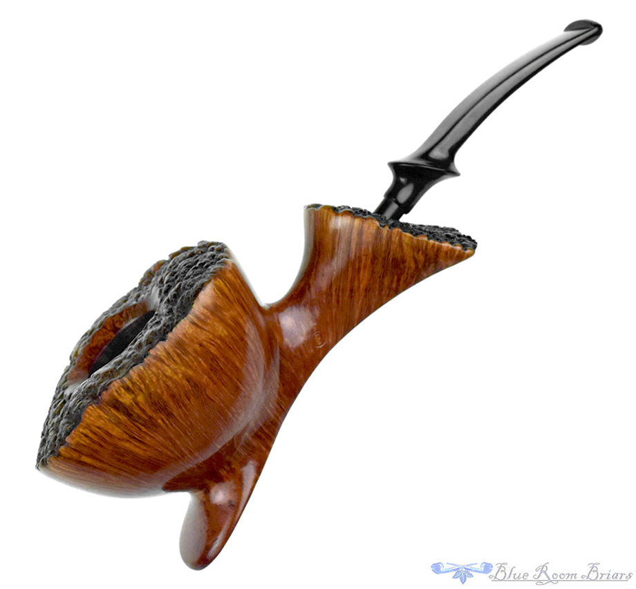 Dense with straight grain, this Hand Cut estate pipe from Danish freehand fame, Preben Holm is impressively decorated with briar's own natural beauty. From the birdseye along the bottom panel, up the sculpted surface of the smooth stummel, all the way to the plateaux at the rim and face of the shank, this gloriously grained freehand is well covered at every possible spot. Wide in the chamber, this smoker will do well with any broad leaf blend and carries a fantastic draw to get the best flavors available in an effortless smoking experience. Large and beautiful, this showcase worthy pipe is in fantastic condition with just a touch of inner rim darkening along the smooth bevel.