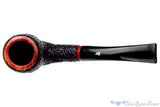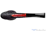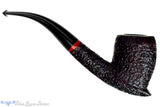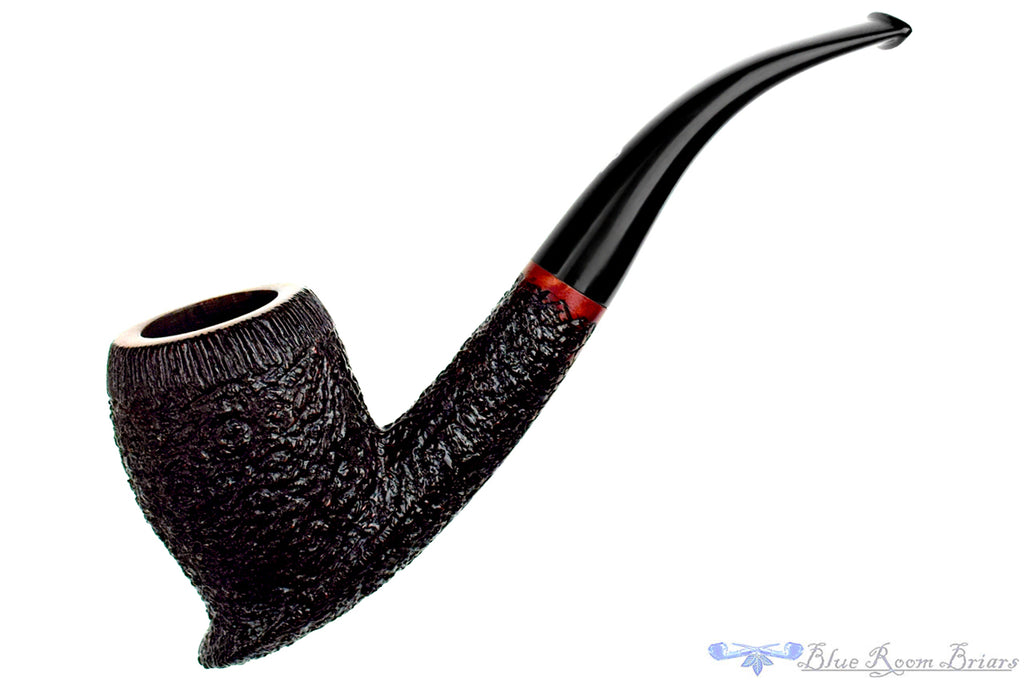 Deeply rusticated with a tight, blistered finish, this Rinaldo estate pipe from Italy has been left smooth and polished at the rim and again at the end of the shank and underneath where the crisp stampings are located. There is a good bit of wood that adds to its heft but this Italian handmade is bent enough to still make a great clencher and offers a particularly voluminous chamber for broad cuts and tongue friendly blends. In excellent condition, this acrylic stemmed brunette is drilled low in the chamber and draws open and smooth to support such a capacious vessel.