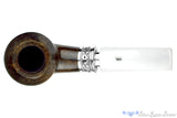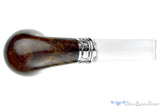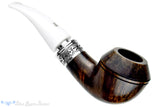 Ser Jacopo's Delecta series is identified by highly elegant shapes that retain the prime functionality of an excellent briar pipe. This bent rhodesian estate pipe certainly meets that criteria with a smooth finish of contrasting straight grain and a striking white stem. The eyes can't pass over the pipe without dwelling on the thick and decorated, unique silver band. And if all that wasn't enough, the drilling and resulting draw are simply impeccable on this Italian brunette. In excellent condition, this beauty also comes with its original box and sleeve.