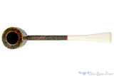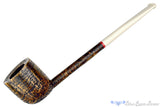 This "Scottie" straight pot, from Kansas City carver, Scottie Piersel, is finished in a superb contrast blast that has been slightly polished to highlight the dynamic tones of light and dark revealing both the growth rings and straight grain inherent to the briar. The canted bowl is marvelously thick in the walls granting a sweet-spot sized chamber versatile enough to enjoy with almost any kind of tobacco. Like all of the "Scottie" pipes, there is a steel tube running through the shank that makes this thin composition several times stronger than a standard briar pipe. Stemmed with an off-white and hand cut piece of Juma, this smooth drawing and American handmade looks to be both roughhewn and sophisticated.
