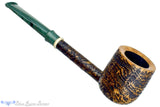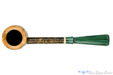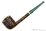 At first glance this high-contrast sandblast "Scottie" looks like many of the other gorgeous clay briars made famous by Our Lady of Briar, Scottie Piersel, from Kansas City. Take a closer look and note that the shank has been offset from the bilateral axis (particularly noticeable in the top-down view). Not a mistake or a misstep, Scottie purposely set the shank to one side of the bowl and the unique treatment adds a wonderful correction to those who clench and can now see a straighter bowl in the periphery. Well constructed and destined to be another magnificent smoker, this green brindle stemmed pot still boasts the thick walls and epically sublime draw the "Scottie" pipes are so popular among collectors for, only this one is just a little more comfortable in the eyes of the smoker.