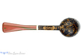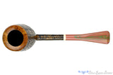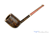 Pencil shanked, with steel reinforcement, this Scottie Piersel "Scottie" pipe carries on the elegant proportions of her famous line with a canted billiard bowl and an impressive, high contrast finish in the blast. A simple band of ivorite and a limited edition colored brindle ebonite stem compliments tone of the stummel that will darken slightly to a warmer, richer color after many smokes. Striking the elusive balance between rugged and elegant, Scottie continues here impressive work creating masteful smokers that are both unique and vibrant.