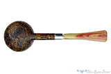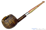 Masterfully proportioned to show off a reinforced shank with steel inner tube, this is not a military mount, but a reverse steel tenon assembly with a silver shank cap. Well blasted to reveal the ever elusive undulating glory that are the natural rings of growth in the briar. Plateaued at the rim with a smooth slanted bevel to the bowl, this wide chambered tomato from Scottie is every bit the English smoker with a gracious splash of color to update this tremendous and smooth drawing smoker.