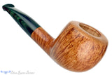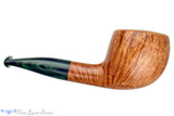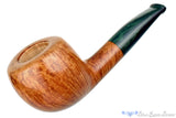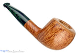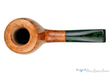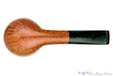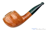 Exceptionally well grained, and finished in a mid contrast smooth polish to prove it, this RC Sands pot isn't very long, but has a tremendously thick wall proportion as he has become famous for. No bowl coat is necessary on a piece this thick and if you haven't already had an opportunity to marry a briar to a specific blend or tobacco type, this beauty is highly recommended. Every year of regular use will continue to develop subtle flavors that just aren't available anywhere else. Fitted with an ebonite stem of green brindle, this American made, muscularly stout, and birdseye rimmed puffer is especially suited for the dark fired burleys and latakia driven tobaccos.