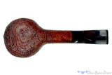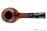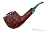 Finished with cascading growth rings, distinct and covering the entirety of the stummel, this RC Sands big bowled apple is a stunning sandblast specimen. Capped at the rim with a polished display of birdseye, this large chambered and ever so slightly bent briar has a bowl coat and will not need any special breaking in. A saddle stem of marbled grey acrylic means it will never oxidize, though the perfect draw may also mean it will be smoked often.