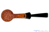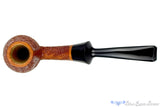 Particularly well blasted in its british tan finish, this modern rhodesian from Russ Cook is an impressive display of growth rings and balanced bent shaping. A single bead graces the widest part of the bowl, which rides low and adds an anchor to the business portion of the pipe. A flared and thick saddle serves as a kind of fulcrum and is the heaviest portion of the whole piece. Fishtailed for a comfortable clencher, this smooth rimmed smoker has a sweet spot sized chamber, well drilled, with a slight conical shape toward the bottom.