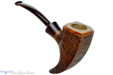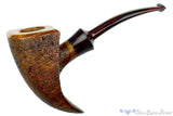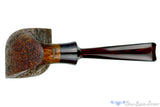 Even with the detailed sandblast, this diamond rimmed pickaxe, or elephant's foot if you prefer, is a showcase of birdseye permanently textured into the acres and acres of this large bowled smoker from Russ's workshop. Beveled both at the chamber and again at the outer shoulder of the rim, this rusty and tonal colored smoker has no shortage of mesmerizing details. Stemmed with classic cumberland brindle, this large smoker has a wide chamber, and like all of Russ's pipes, is extremely well drilled to be a fantastic smoker.