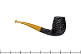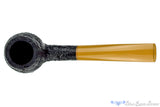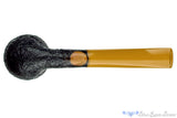 Egg shaped in the bowl and under bent to be even more comfortable as a clencher, this black ring blast billiard from American carver, Sean Reum, has a distinctly detailed finish of growth rings and straight grain oriented to the tall bowl. Fitted with an ebonite stem in a baked honey color, this deep chambered smoker is drilled as a cylinder with a draft hole all the way down at the bottom and a magnificently smooth draw. Light enough to keep clenched from start to finish, this black blasted beauty is still deep enough to do so for hours at a time.