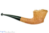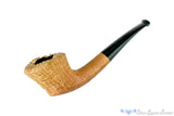 Blonde, blasted, and covered in growth rings cascading down from the plateau filled rim to the flat skater bottom of the stummel, this bent bombshell from American pipe maker, Sean Reum, is fitted with a green, bronze, and black brindle stem of ebonite. This light of a finish is a testament to the rare quality of this briar specimen as there is no place for any flaws to hide. Sean turned it into a curvy shape and drilled a virginia forward, conical chamber making a comfortable clencher that will stop traffic unless appropriate care is taken while smoking in public.