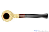 In addition to the artistic handmades that German carver, Steffen Mueller produces, he adds more conservative shapes to his offerings under the brand, The Pipemill. This scalloped prince has a pale driftwood finish and a stout carved bowl of thick proportion. The chamber is sized just right for virginias, both loose and in flake form, and the lightweight vessel of tapered design is tremendously comfortable to clench. Engineered to be one of the finest smokers, this eye popping and tactile delight straight prince will color to a warmer, richer tone with time and use, both of which will be a pleasure to apply.