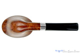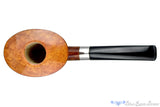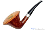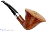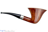 Dramatic and substantial in size, this smooth finished fan dublin from American, carver Todd Harris, features a straight grain orientation and a broad, elongated rim of lighter shade and packed with birdseye, mesmerizing on the slightly domed surface. Tapered and adorned with a nickel band, the deep chamber is both wide and cylindrical with a perfectly centered draft hole at the very bottom. Alluring with a perfectly tucked transition, this large bowled smoker is far too heavy for most to clench, but will be a pleasure to hold about the rim through many great and long lasting smoking sessions.